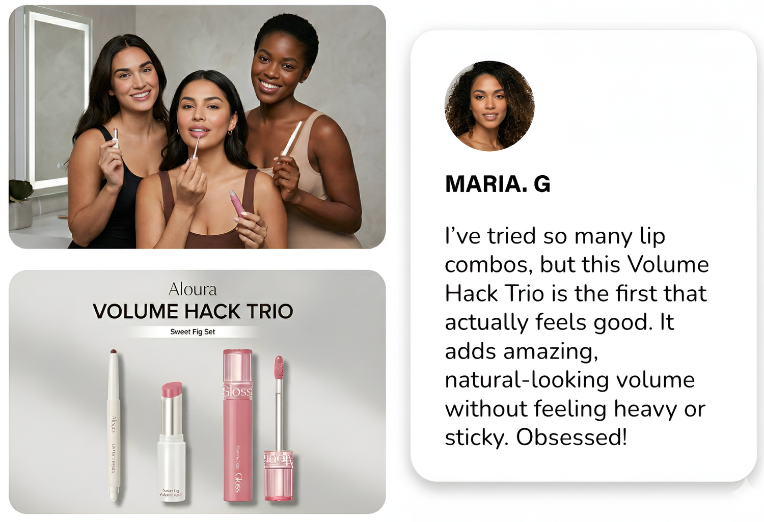 The perfect plump starts here. The ALOURA Volume Hack Trio is your complete lip routine — line, melt, and gloss for fuller-looking lips in minutes. Designed to define, enhance, and add that irresistible shine, this trio works together to give you smooth, sculpted, high-volume lips that turn heads from every angle.